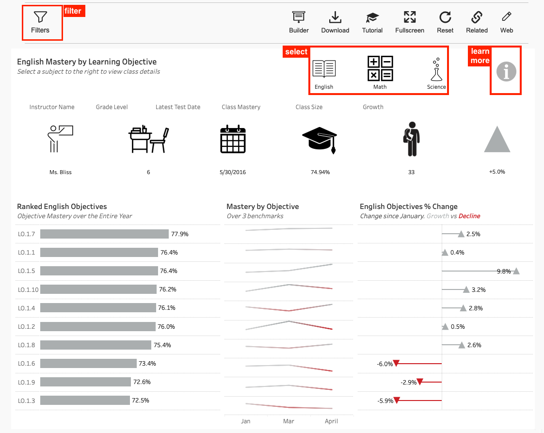 Select a content area from the icons at the top of the dashboard to filter. The summary statistics show key information for each class. The charts below show the top objectives the selected content, as well as objective mastery for each of the 3 months and the overall class growth or decline for each objective. Hover over the table for details on each student's growth.